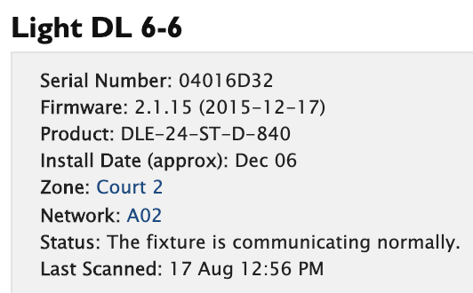 - Click the fixture name (top row) to access a fixture information page containing the serial number