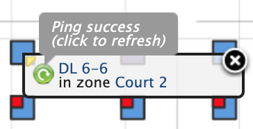 - Clicking the status circle in the pop-up will ping the fixture to check the communications status. If the ping is successful, then the communications status will return green with a "Ping success" message. If the ping fails, then the communications status will return red with a "Ping failed" message.