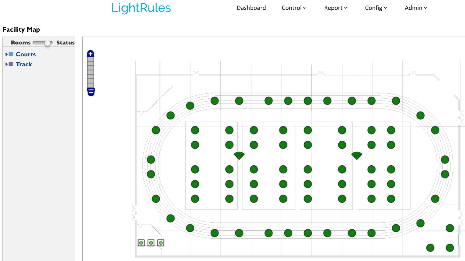 In LightRules, click the Config tab and select Map to view the LightRules Facility Map. By default the Facility Map displays the rooms and zones within the facility.Move the slider in the top-left from Rooms to Status to view the communications status of each fixture. Communicating fixtures will display as green circles while non-communicating fixtures will display as yellow or red circles.