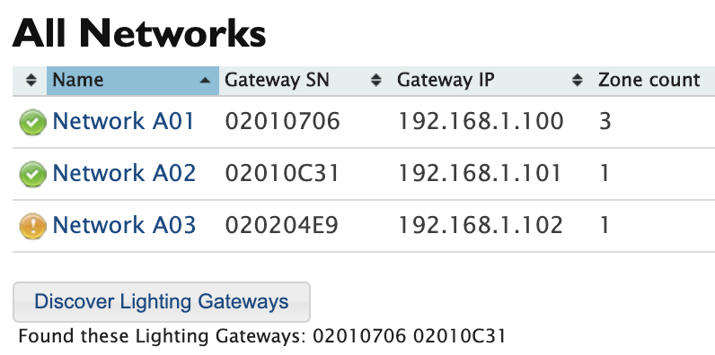 The Discover Lighting Gateways feature is useful for determining if a gateway serial number may have been mistyped in the map file, for seeing if newly installed gateways are able to communicate with the LRA or for getting a general sense of how many gateways the LRA is able to communicate with. For gateways in the map file, clicking the status circle in the Config | Network page is a more targeted means of troubleshooting.