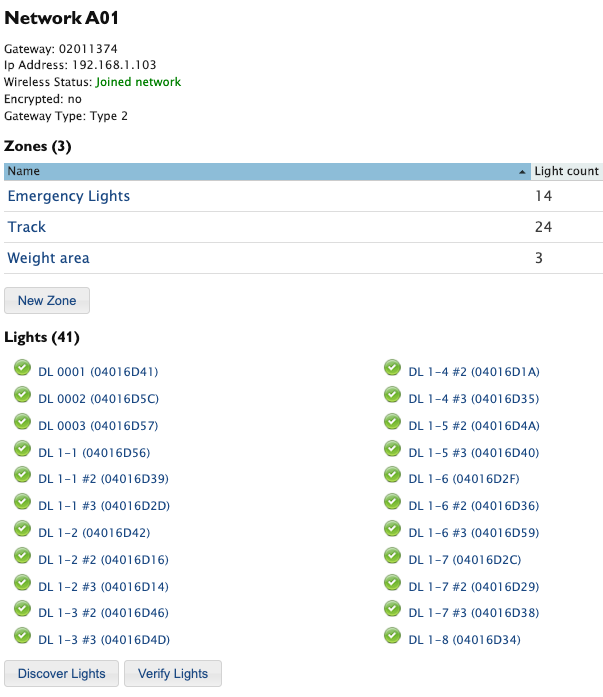 If the gateway has a green status circle in Config | Network and appears to be communicating with the LRA, there are a few useful steps for verifying that the gateway is able to communication with fixtures on its network.